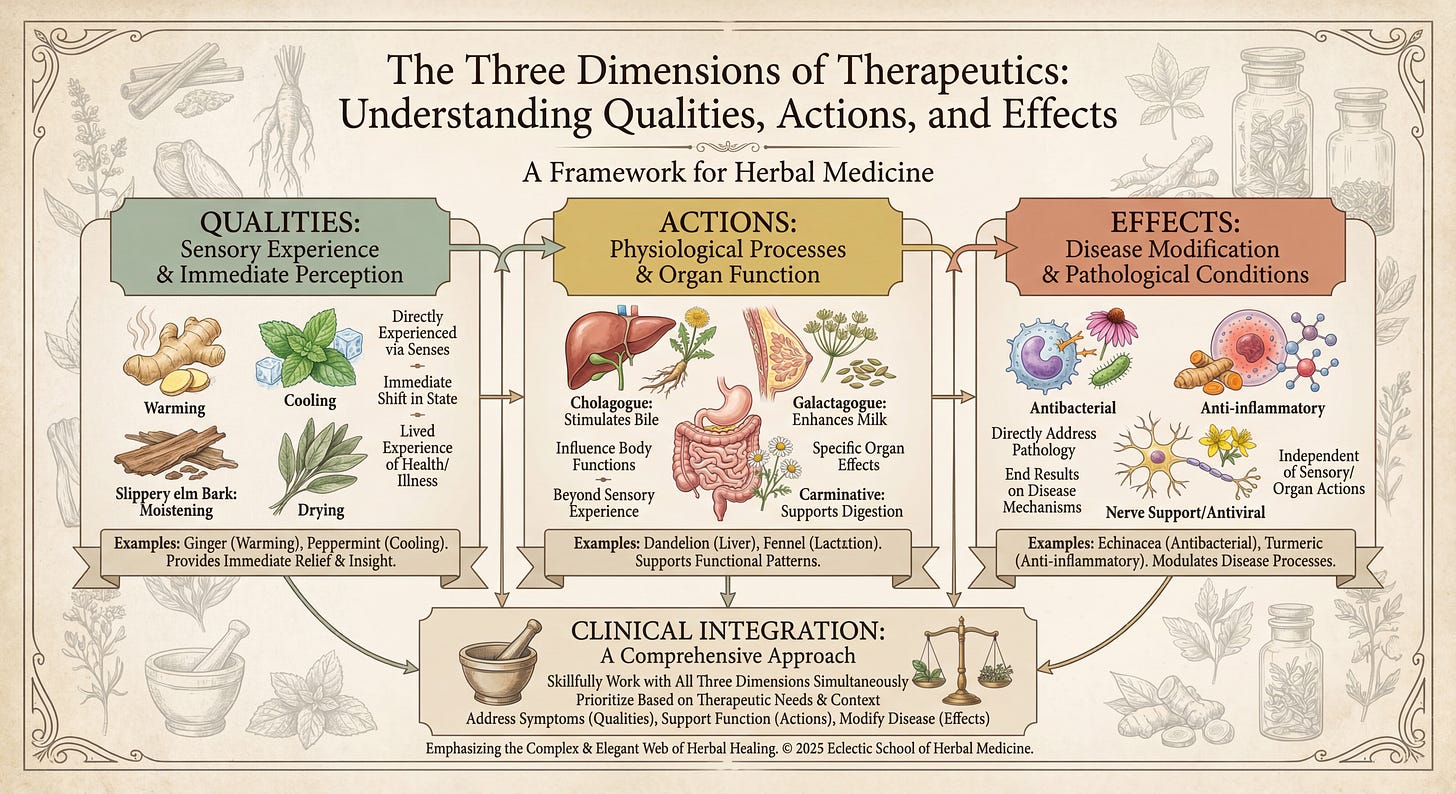 This three-dimensional system - Qualities, Actions, and Effects - lets us identify herbs that will reliably shift experiential states, support specific organ systems, and in some instances, address disease processes directly. Each term narrows our choices and helps match herbs to real clinical situations.